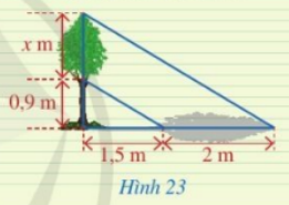 Người ta đo bóng của một cây và được các số đo ở Hình 23. Giả sử rằng các tia nắng song song với nhau, hãy tính độ cao \(x\).