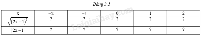 Hãy chép lại và hoàn thành Bảng 3.1. Em có nhận xét gì về giá trị của \(\sqrt {{{\left( {2x – 1} \right)}^2}} \) và \(\left| {2x – 1} \right|\)?