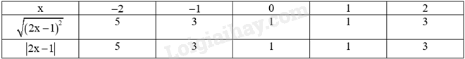 Thay từng giá trị của x vào các căn thức \(\sqrt {{{\left( {2x – 1} \right)}^2}} \) và \(\left| {2x – 1} \right|\) để tính giá trị tương ứng, từ đó rút ra nhận xét.