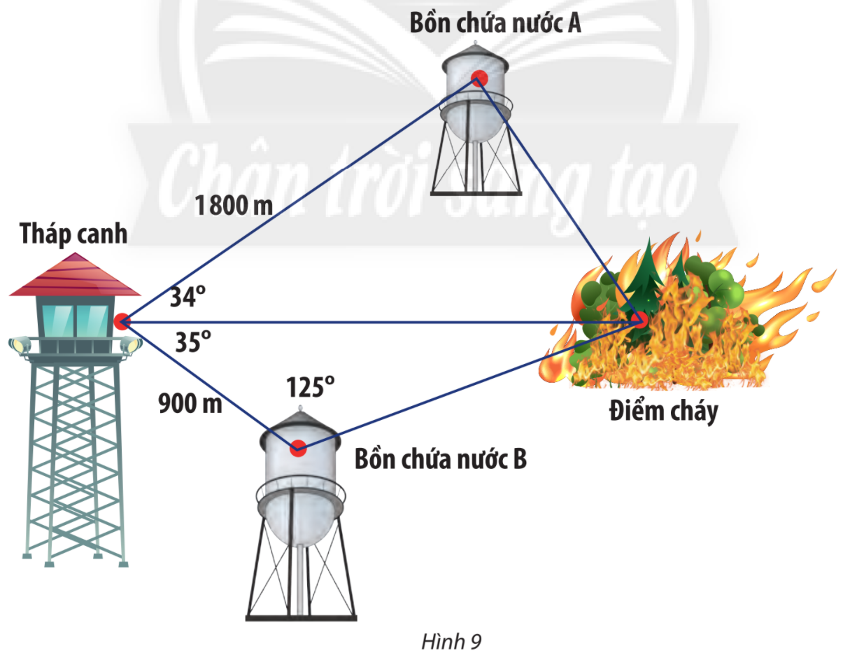 Trong một khu bảo tồn, người ta xây dựng một tháp canh và hai bồn chứa nước A, B để phòng hỏa hoạn. Từ tháp canh, người ta phát hiện đám cháy và số liệu đưa về như Hình 9. Nên dẫn nước từ bồn chứa A hay B để dập tắt đám cháy nhanh hơn?