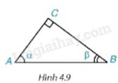 Cho tam giác ABC vuông tại C, có \(\widehat A = \alpha ,\widehat B = \beta \) (H.4.9) . Hãy viết các tỉ số lượng giác của góc \(\alpha ,\beta \) theo độ dài các cạnh của tam giác ABC. Trong các tỉ số đó, cho biết các cặp tỉ số bằng nhau.