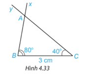 Vẽ đoạn thẳng \(BC = 3\;{\rm{cm}}\). Vẽ hai tia Bx và Cy sao cho \(\widehat {xBC} = {80^\circ },\widehat {yCB} = {40^\circ }\) như Hình 4.33.