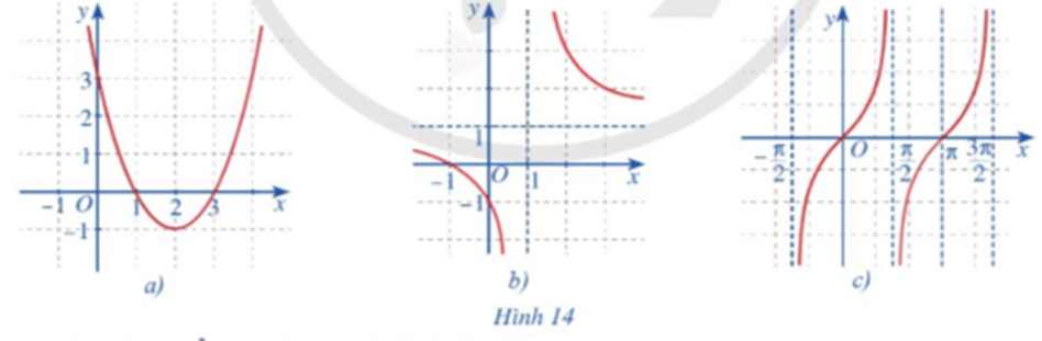 Quan sát đồ thị các hàm số: \(y = {x^2} – 4x + 3\) (Hình 14a); \(y = \frac{{x + 1}}{{x – 1}}\,\,\left( {x \ne 1} \right)\) (Hình 14b); \(y = \tan x\) (Hình 14c) và nêu nhận xét về tính liên tục của mỗi hàm số đó trên từng khoảng của tập xác định.