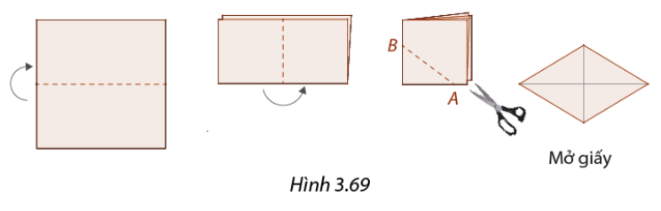 Gấp một tờ giấy làm tư như Hình 3.69 và cắt chéo theo đường \(AB\) bất kì (\(A,B\) nằm trên hai mép gấp). Sau khi mở giấy, tứ giác cắt được là hình gì? Vì sao?