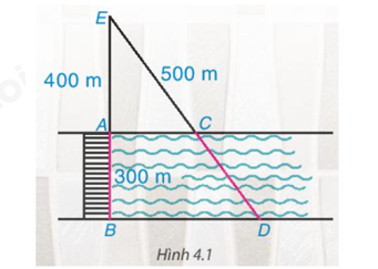 Cây cầu AB bắc qua một con sông có chiều rộng 300 m. Để đo khoảng cách giữa hai điểm C và D trên hai bờ con sông, người ta chọn một điểm E trên đường thẳng AB sao cho ba điểm E, C, D thẳng hàng. Trên mặt đất, người ta đo được AE = 400 m, EC = 500 m. Theo em, người ta tính khoảng cách giữa C và D như thế nào?