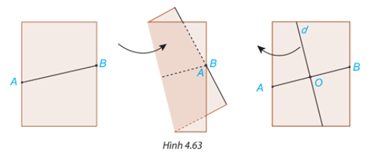 Đánh dấu hai điểm A và B nằm trên hai mép tờ giấy A4, nối A và B để được đoạn thẳng AB. Gấp mảnh giấy lại như Hình 4.63 sao cho vị trí các điểm A và B trùng nhau. Mở mảnh giấy ra, kẻ một đường thẳng d theo nếp gấp. a) Gọi O là giao điểm của đường thẳng d và AB. O có là trung điểm của đoạn thẳng AB không? b) Dùng thước đo góc, kiểm tra đường thẳng d có vuông góc với AB không?