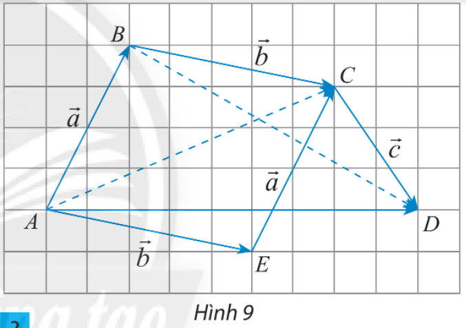 Cho 3 vectơ \(\overrightarrow a ,\overrightarrow b ,\overrightarrow c \) được biểu diễn như hình 9. Hãy hoàn thành các phép cộng vectơ sau và so sánh kết quả tìm được: