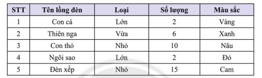Thống kê về các loại lồng đèn mà các bạn học sinh lớp 8C làm được để trao tặng cho trẻ em khuyết tật nhân dịp Tết trung thu được cho trong bảng dữ liệu sau: