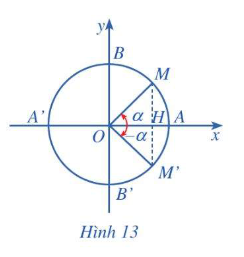 Trên đường tròn lượng giác, cho hai điểm M, M’ sao cho góc lượng giác \(\left( {OA,OM} \right) = \alpha ,\,\,\left( {OA,OM’} \right) =  – \alpha \) (Hình 13)