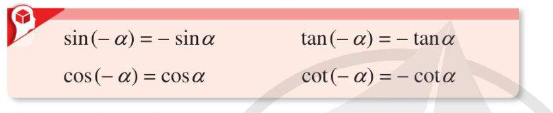 \(\begin{array}{l}\cos \left( { – 30^\circ } \right) = \frac{{\sqrt 3 }}{2} > 0\\\sin \left( { – 30^\circ } \right) =  – \frac{1}{2} < 0\\\tan \left( { – 30^\circ } \right) =  – \frac{{\sqrt 3 }}{3} < 0\\\cot \left( { – 30^\circ } \right) =  – \sqrt 3  < 0\end{array}\)
