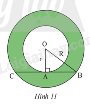 Cho hình vành khuyên giới hạn bởi hai đường tròn (O; r) và (O; R) với R > r. Trên đường tròn (O; R) lấy hai điểm B, C sao cho BC vừa là dây cung của (O; R), vừa là tiếp tuyến của đường tròn (O; r) tại A (Hình 11)
