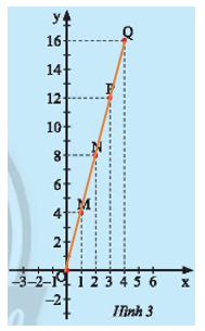 Hùng vẽ các điểm \(M\left( {1;4} \right);N\left( {2;8} \right);P\left( {3;12} \right);Q\left( {4;16} \right)\) trên mặt phẳng tọa độ \(Oxy\) như Hình 3. Hãy dùng thước thẳng để kiểm tra các điểm \(O;M;N;P;Q\) có thẳng hàng không.