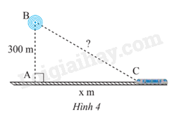 Một trạm phát sóng được đặt ở vị trí B cách đường tàu một khoảng AB = 300 m. Đầu tàu đang ở vị trí C, cách vị trí A một khoảng AC = x (m) (Hình 4)