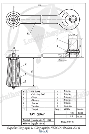 Quan sát bản vẽ lắp tay quay ở Hình 33, hãy cho biết: