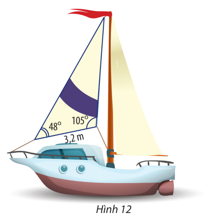 Tính diện tích một cánh buồm hình tam giác. Biết cách buồm đó có chiều dài một cạnh là 3,2 m và hai góc kề cách đó có số đo là 48 và 105) (Hình 12).
