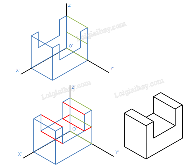 e) Từ các hình chiếu vuông góc và hình biểu diễn của vật thể dựng hình chiếu trục đo.