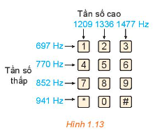 Khi nhấn một phím trên điện thoại cảm ứng, bàn phím sẽ tạo ra hai âm thuần, kết hợp với nhau để tạo ra âm thanh nhận dạng duy nhất phím. Hình 1.13 cho thấy tần số thấp \({f_1}\) và tần số cao \({f_2}\) liên quan đến mỗi phím. Nhấn một phím sẽ tạo ra sóng âm \(y = \sin \left( {2\pi {f_1}t} \right) + \sin \left( {2\pi {f_2}t} \right)\), ở đó t là biến thời gian (tính bằng giây).