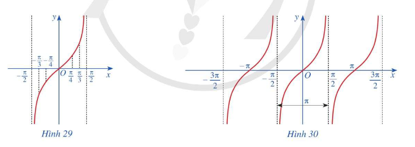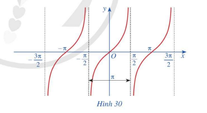 c)     Làm tương tự như trên đối với các khoảng \(\left( {\frac{\pi }{2};\frac{{3\pi }}{2}} \right),\left( { – \frac{{3\pi }}{2}; – \frac{\pi }{2}} \right)\),…ta có đồ thị hàm số \(y = \tan x\)trên D được biểu diễn ở Hình 30.