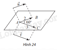 Trong không gian, cho \(\overrightarrow u \) và \(\overrightarrow v \) thoả mãn \(|\overrightarrow u | = 2\) , \(|\overrightarrow v | = 3\). Lấy một điểm A bất kì, gọi B và C là hai điểm sao cho \(\overrightarrow {AB}  = \overrightarrow u \), \(\overrightarrow {AC}  = \overrightarrow v \) (Hình 24). Giả sử \(\widehat {BAC} = 60^\circ \)