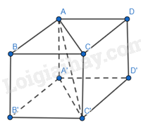 \(AC = \sqrt 2 \); CC’ = 1 => \(\tan (\overrightarrow {AC} ,\overrightarrow {AC’} ) = \tan \widehat {C’AC} = \frac{{CC’}}{{AC}} = \frac{1}{{\sqrt 2 }} \Rightarrow \widehat {C’AC} = 45^\circ \)