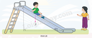 Một em nhỏ cân nặng m = 25 kg trượt trên cầu trượt dài 3,5m. Biết rằng, cầu trượt có góc nghiêng so với phương nằm ngang là \(30^\circ \) (Hình 26).