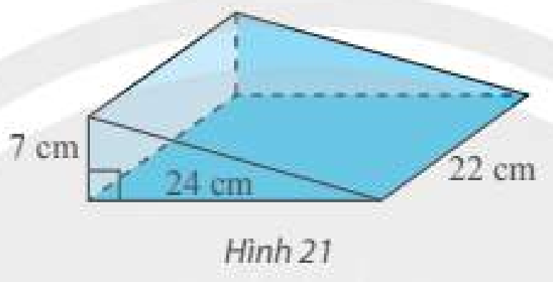 Tính thể tích cái nêm hình lăng trụ đứng có kích thước như trong Hình 21.