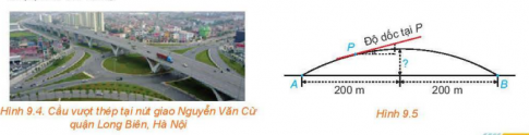 Người ta xây dựng một cây cầu vượt giao thông hình parabol nối hai điểm có khoảng cách là 400 m (H.9.4). Độ dốc của mặt cầu không vượt quá 100 (độ dốc tại một điểm được xác định bởi góc giữa phương tiếp xúc với mặt cầu và phương ngang như Hình 9.5). Tính chiều cao giới hạn từ đỉnh cầu đến mặt đường (làm tròn kết quả đến chữ số thập phân thứ nhất).