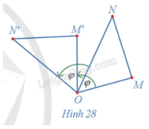 Trong Hình 28, cho các điểm M’, N’ lần lượt là ảnh của các điểm M, N qua phép quay tâm O với góc quay φ.