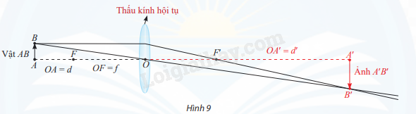 \(\frac{1}{f} = \frac{1}{d} + \frac{1}{{{d’}}}\) hay \(d’ = \frac{{df}}{{d – f}}\)