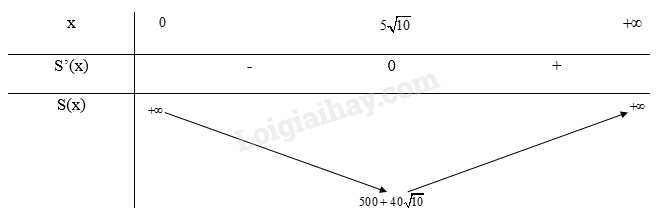 \(S'(x) = 4 – \frac{{1000}}{{{x^2}}} = 0 \Leftrightarrow \left[ \begin{array}{l}x = 5\sqrt {10} \\x =  – 5\sqrt {10} (loai)\end{array} \right.\)