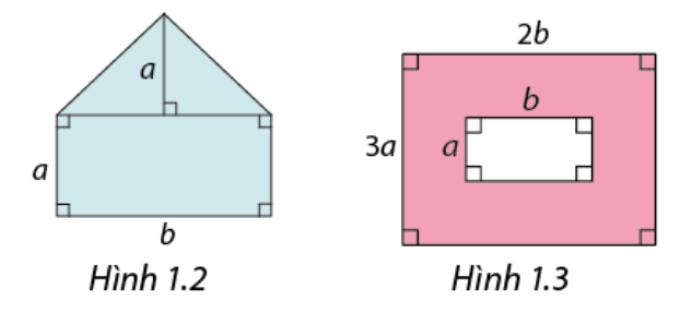 Vậy diện tích phần tô màu hình 1.3 là: \(3a.2b – a.b = 6ab – ab = 5ab\)
