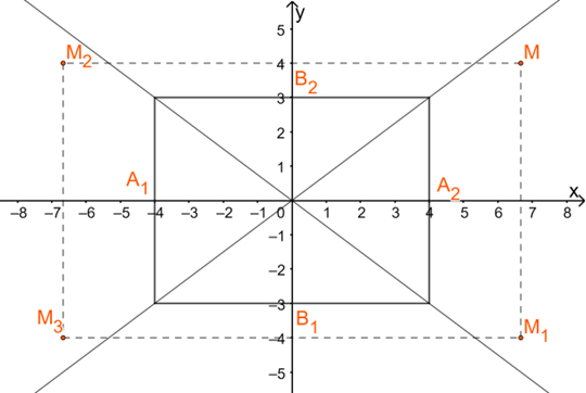 Bước 2: Vẽ hai đường chéo của hình chữ nhật sơ sở. Điểm \(M(\frac{{20}}{3};4)\) thuộc (H). Do đó các điểm \({M_1}(\frac{{20}}{3}; – 4),{M_2}( – \frac{{20}}{3};4),{M_3}( – \frac{{20}}{3}; – 4)\) thuộc (H).