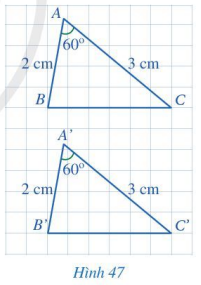 Cho hai tam giác ABCA’B’C’ (Hình 47) có: AB = A’B’ = 2 cm, \(\widehat A = \widehat {A’} = 60^\circ \), AC = A’C’ = 3 cm. Bằng cách đếm số ô vuông, hãy so sánh BCB’C’. Từ đó có thể kết luận được hai tam giác ABCA’B’C’ bằng nhau hay không?