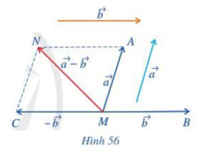 a) Vẽ \(\overrightarrow {MA}  = \overrightarrow a ,\;\overrightarrow {MB}  = \overrightarrow b ,\;\overrightarrow {MC}  =  – \overrightarrow b \) (Hình 56)