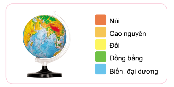 1. Các màu trên bề mặt quả địa cầu cho biết các dạng địa hình trên Trái Đất gồm núi, cao nguyên, đồi, đồng bằng, biển và đại dương.