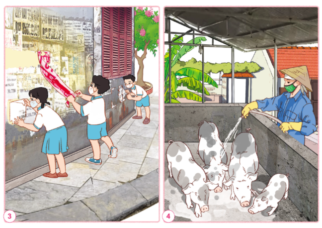 – Hình 3: Các bạn nhỏ đang tháo băng rôn và các tờ giấy quảng cáo trên tường.