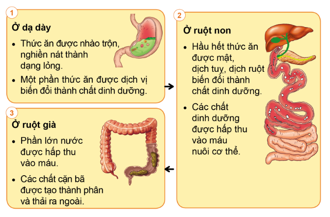 Chỉ và nói quá trình tiêu hóa thức ăn ở dạ dày, ruột non, ruột già trong các hình dưới đây.