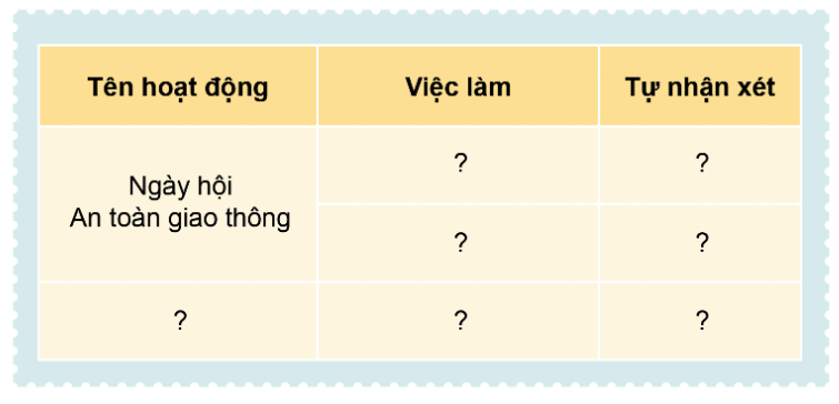 Chọn một hoạt động kết nối với xã hội mà trường em đã tổ chức và thảo luận theo gợi ý sau. Chia sẻ kết quả thảo luận với cả lớp. Hãy tự đánh giá việc tham gia của em trong hoạt động kết nối với xã hội theo gợi ý dưới đây và chia sẻ với bạn.