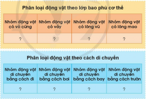 Phân loại động vật dựa trên lớp bao phủ cơ thể và cách di chuyển. Xếp các con vật trong hình trên vào các nhóm theo gợi ý dưới đây.