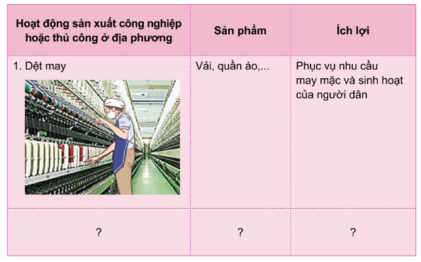 1. Chia sẻ về một số hoạt động sản xuất công nghiệp hoặc thủ công nghiệp ở địa phương em theo gợi ý dưới đây.