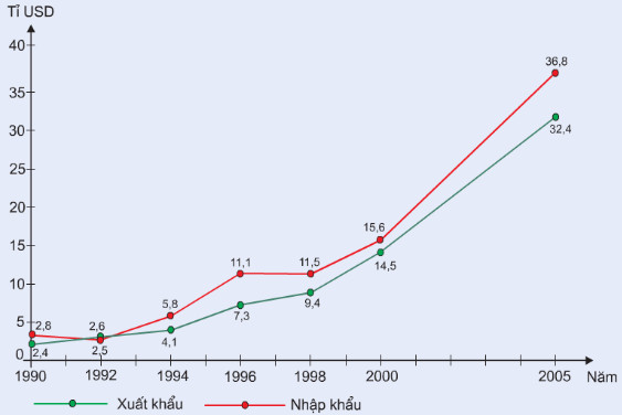 – Nhận xét: Giá trị xuất khẩu tăng nhanh và liên tục từ 2,4 tỉ USD (1990) lên 32,4 tỉ USD (2005), gấp 13,5 lần, tăng nhanh hơn giá trị nhập khẩu.