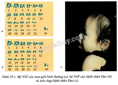 Bộ NST của người bị bệnh Đao gồm 47 NST, gồm 23 cặp NST (22 cặp NST thường, 1 cặp NST giới tính), cặp NST số 21 có 3 chiếc.