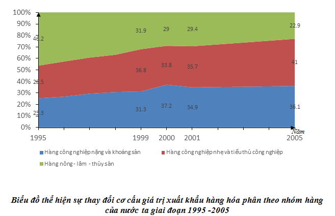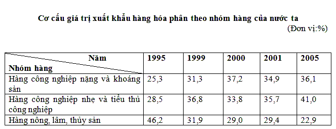 + Từ năm 1995 đến năm 2005, cơ cấu giá trị xuât khẩu hàng hoá phân theo nhóm hàng của nước ta có sự thay đổi: