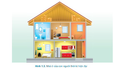1. Hình 1.3 thể hiện các vai trò nào của nhà ở? 2. Em hãy giải thích câu nói: "Ngôi nhà là tổ ấm" 3. Vì sao nói nhà ở cũng có thể là nơi làm việc và học tập của con người?