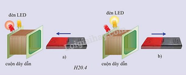 Gắn hai đèn LED (một đèn màu đỏ, một đèn màu vàng) song song ngược chiều nhau vào hai đầu cuộn dây dẫn. Đặt trước cuộn dây dẫn một thanh nam châm như hình H20.4.