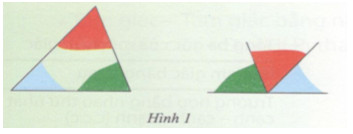 Cắt một tấm bìa thành hình tam giác và to màu ba góc của tam giác. Cắt rời ba góc ra khỏi tam giác rồi đặt ba góc kề nhau như hình 1.