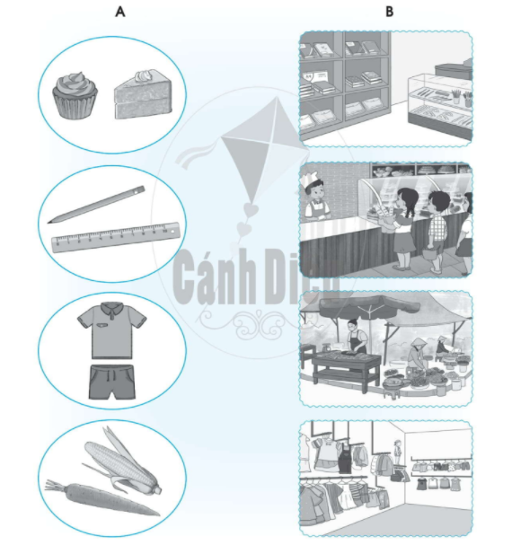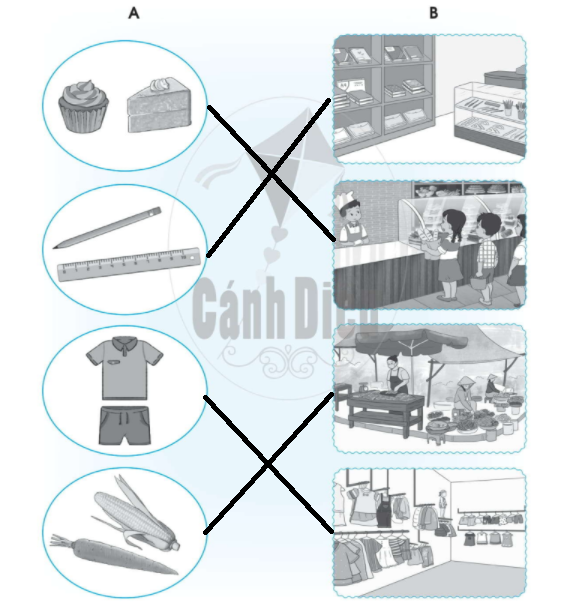 – Sau đó dựa vào kinh nghiệm của bản thân và nối loại hàng hóa ở cột A với địa điểm mua sắm phù hợp ở cột B. Ví dụ: em hay mua bút, thước ở nhà sách; mua bánh ngọt ở tiệm bán bánh,…
