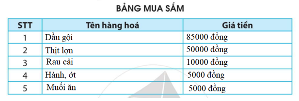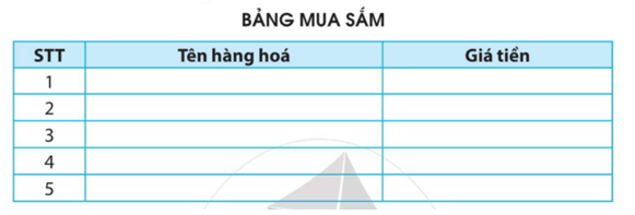 Em hãy nhớ lại một lần đi mua sắm hàng hóa cùng người thân để hoàn thành bảng mua sắm sau: