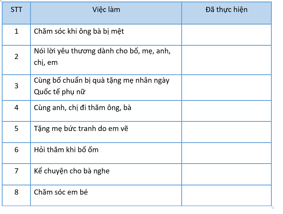 Trong các việc ở bảng trên, em hãy vẽ mặt cười vào ô có những việc mà em đã làm để thể hiện sự quan tâm, chăm sóc của em