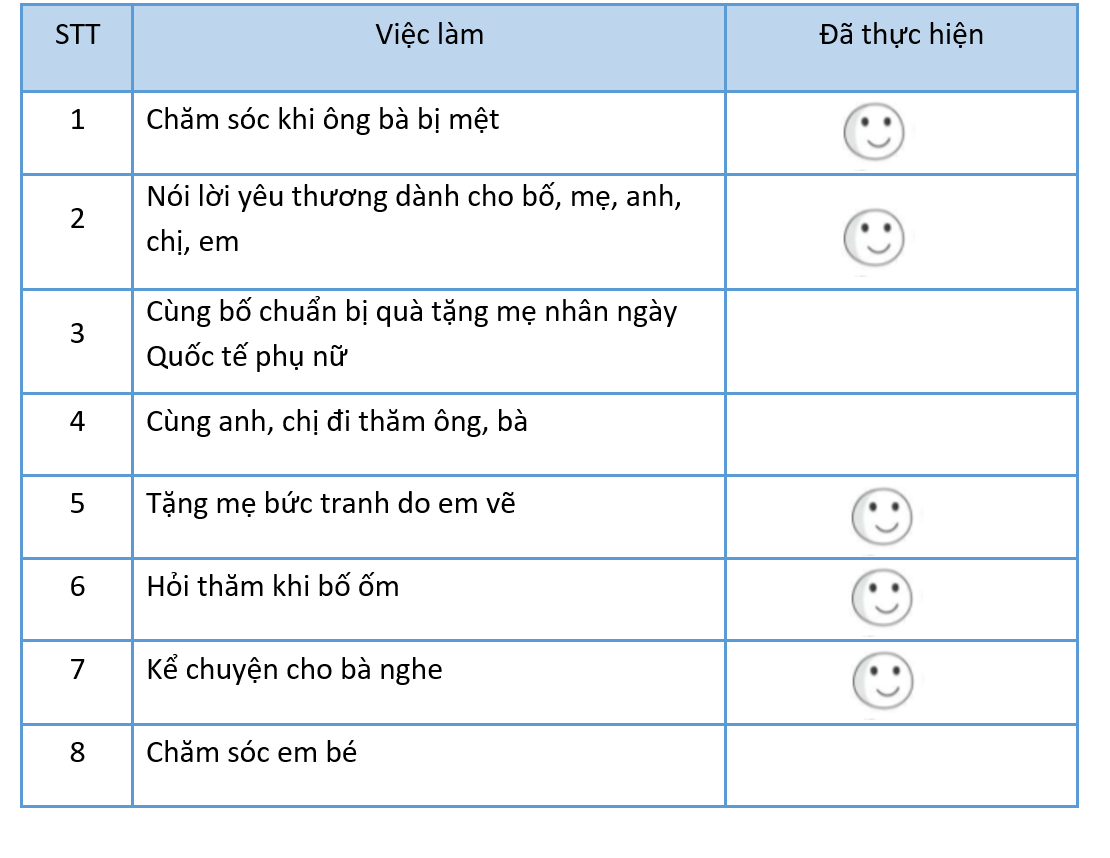 Vẽ hình mặt cười vào các việc em đã làm thể hiện sự quan tâm, chăm sóc người thân